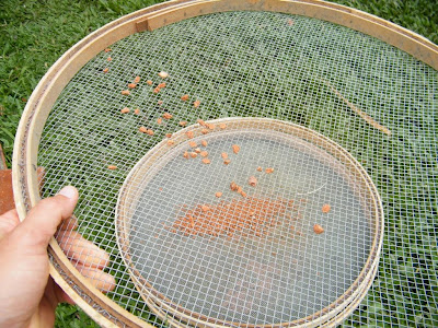 Com peneiras de furos de tamanhos diversos, podemos conseguir variedade quanto ao tamanho dos grãos: