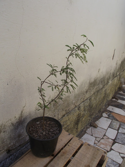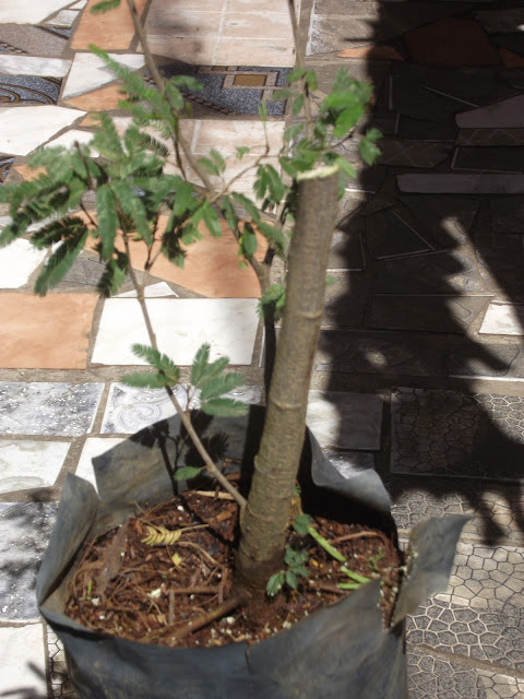 Dias atras fui no Ceagesp Sorocaba e comprei uma caliandra por módicos 10 reais! Ela ainda é uma muda bem dizendo, tem o caule bem fino, com uns 2 centímetros de diâmetro, e uns 80 de comprimento.