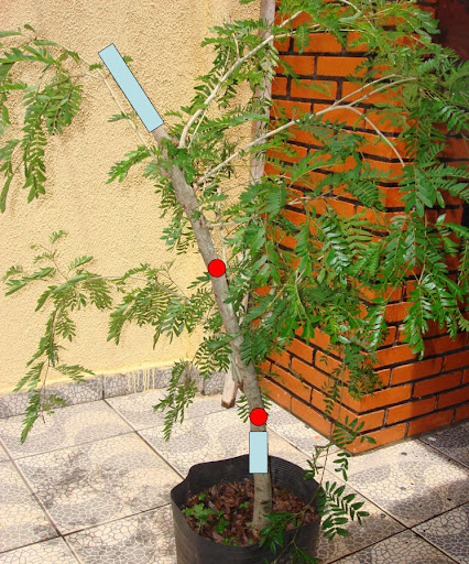 Vou fazer 2 alporquias nessa caliandra. Pensei em fazer as alporquias nos pontos indicados com o circulo vermelho na figura abaixo. O que vocês acham?